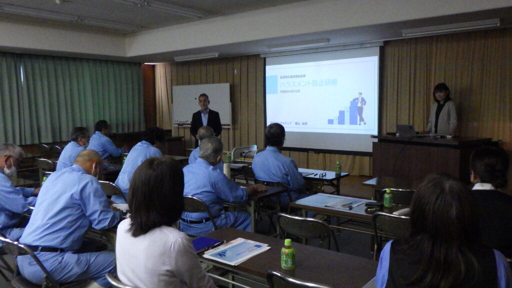 新年度となり、延岡地区建設事業協同組合にも新しいメンバーが加わり、働きやすい環境づくり、事故防止等の為にも事務局内研修を実施しました。株式会社Career Pekoより横山講師にお越しいただき、「ハラスメント防止」について学びました。