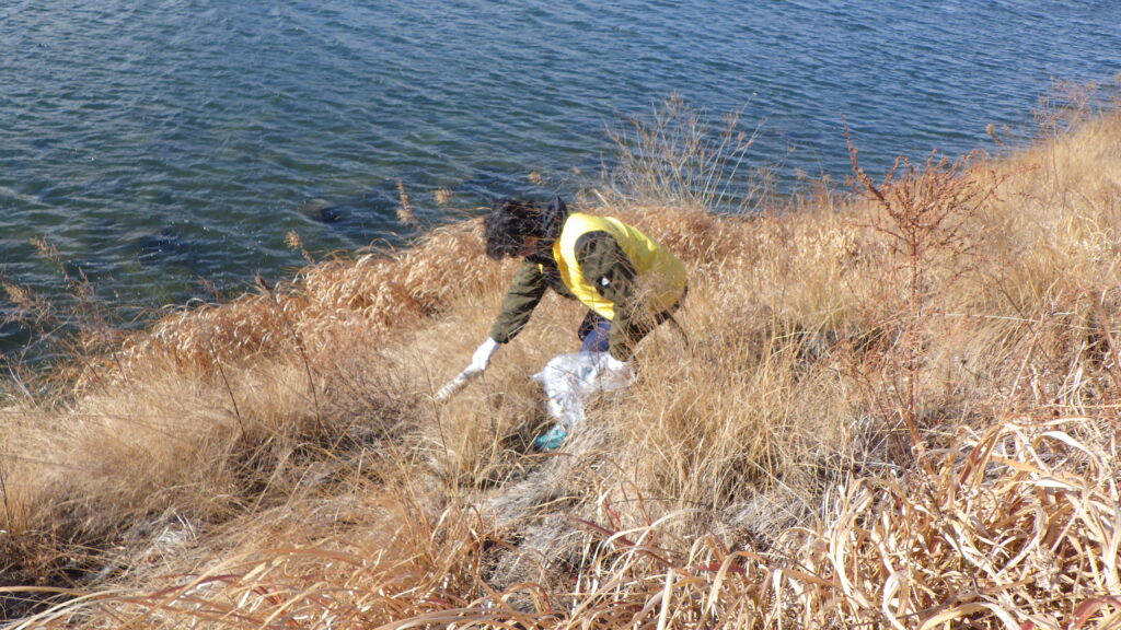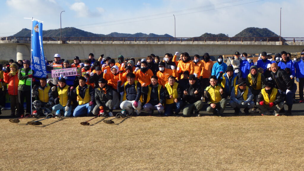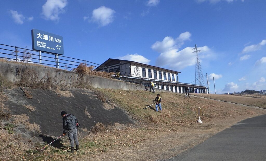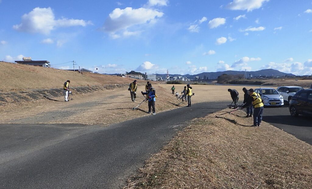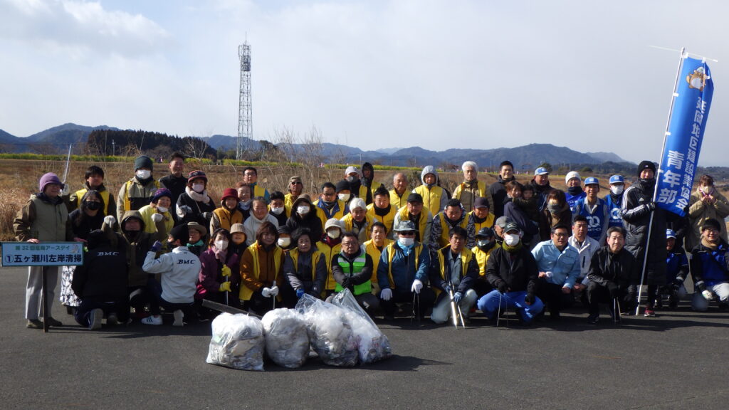 今回、青年部が担当した活動場所は2か所。大瀬大橋河川敷での草刈り作業と、五ヶ瀬川河川敷での清掃活動を行いました。風が強くとっても寒い中での作業でしたが、美しい川づくりのために取り組みました。